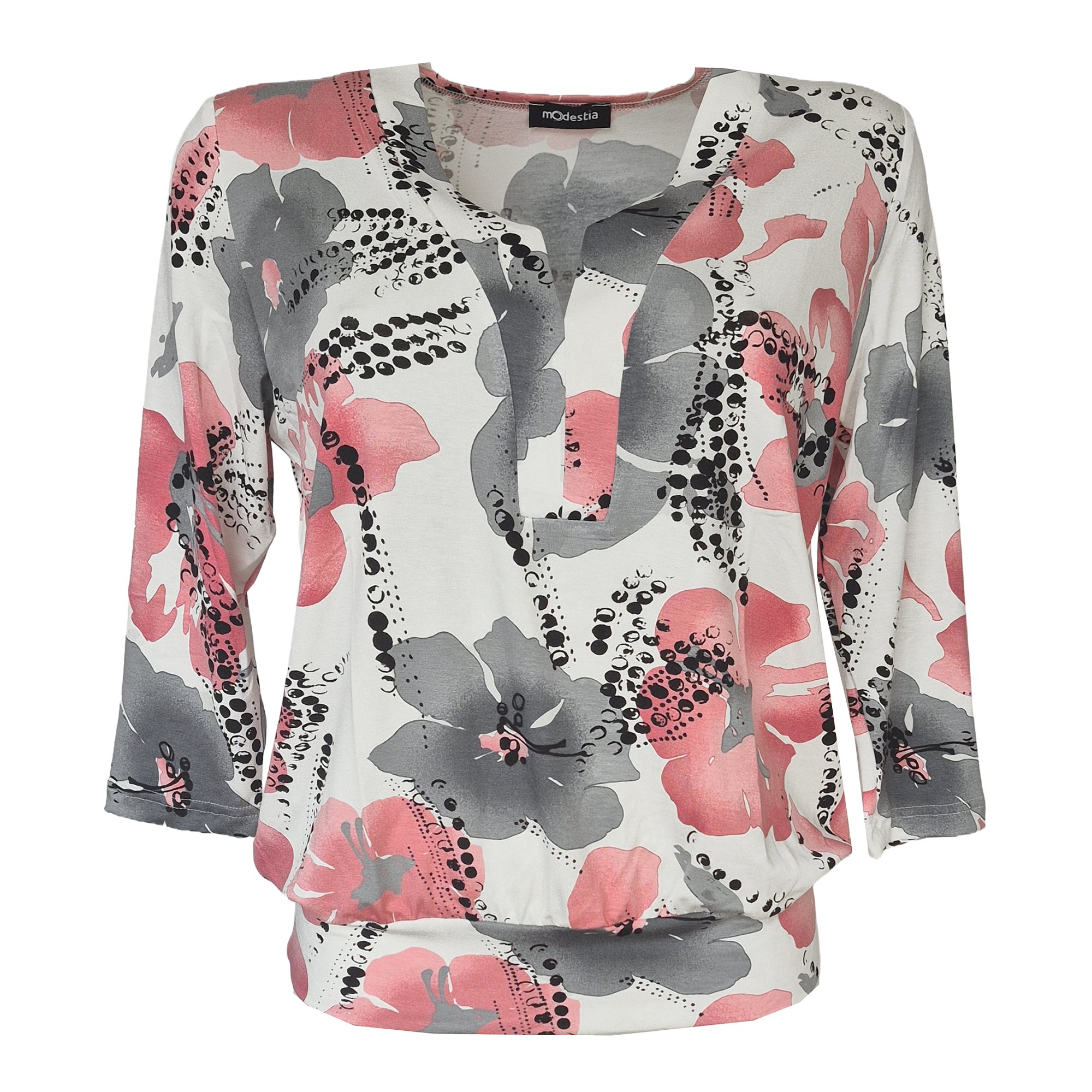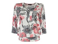 Dámská halenka s jemným a zároveň výrazným květinovým potiskem v kombinaci šedé, černé a tlumené korálové barvy na světlém podkladu. Lehký, splývavý materiál zajišťuje maximální komfort při nošení. Halenka má elegantní výstřih do „V“ s decentním rozparkem a 3/4 rukávy, které působí vzdušně a žensky. Spodní okraj nabraný do širokého lemu díky kterému halenka krásně drží tvar a lichotí postavě. Ideální volba pro každodenní nošení i do práce. Materiál 95% viskóza, 5% ekastan.