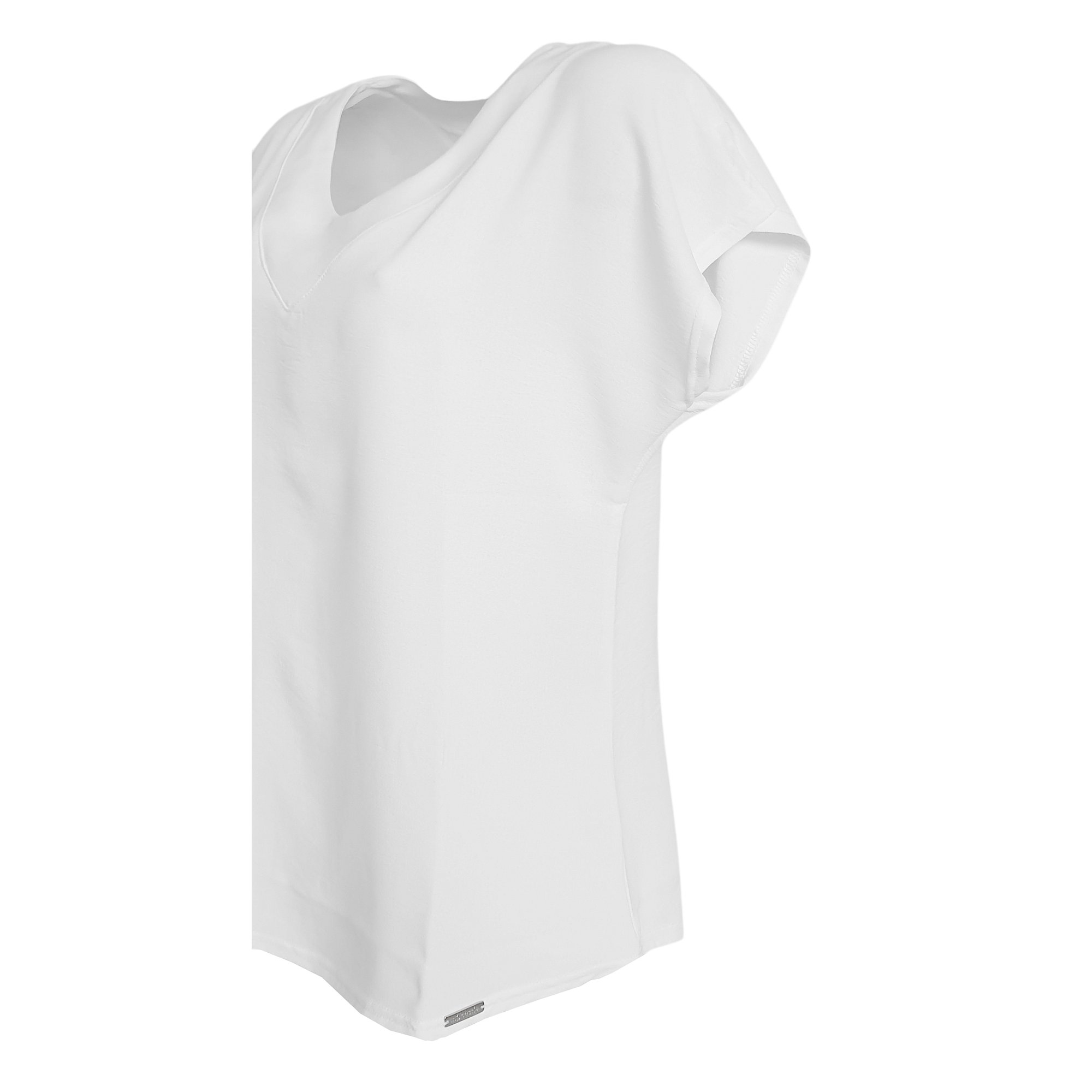 Volné triko s kimonovým rukávem s výstřihem do V v bílé barvě. Pereme v pračce na 30°. 95% viskóza 5% elestan