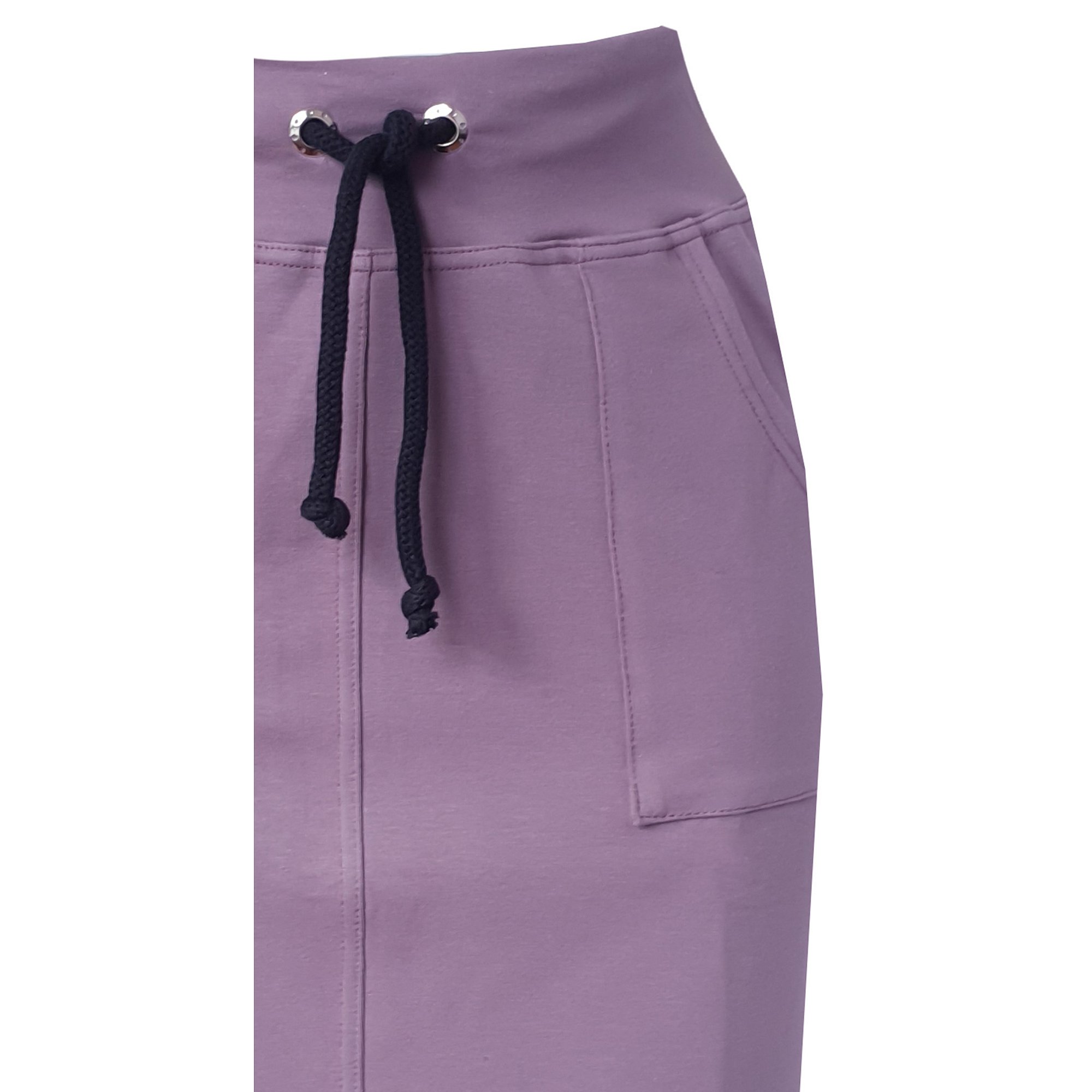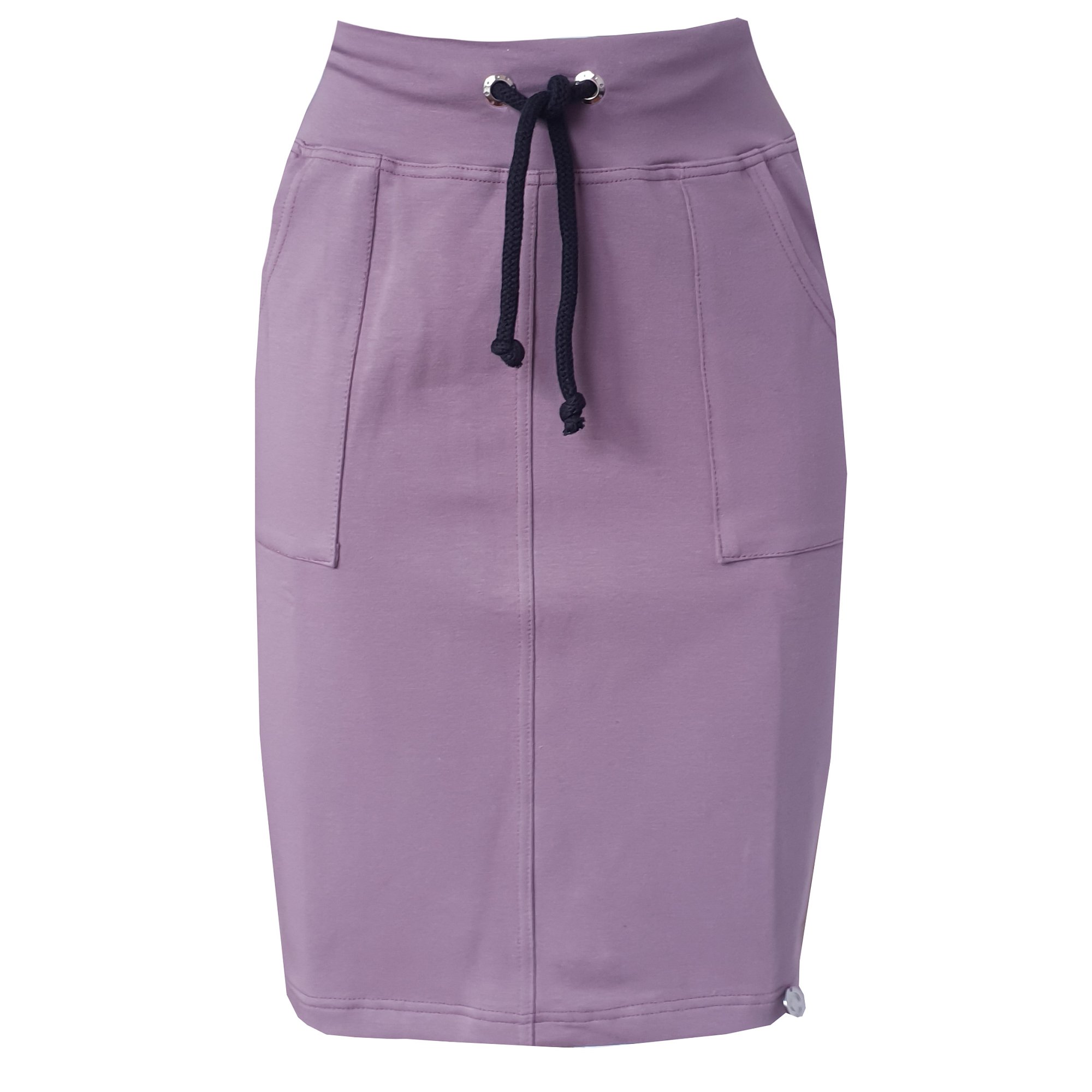 Rovná volnočasová sukně s našitými kapsami a šňůrou v pase ve fialovo šedé barvě. Celková délka včetně pasu je 52 cm. Pereme v pračce na 30°. Materiál: 97% bavlna 3% elastan