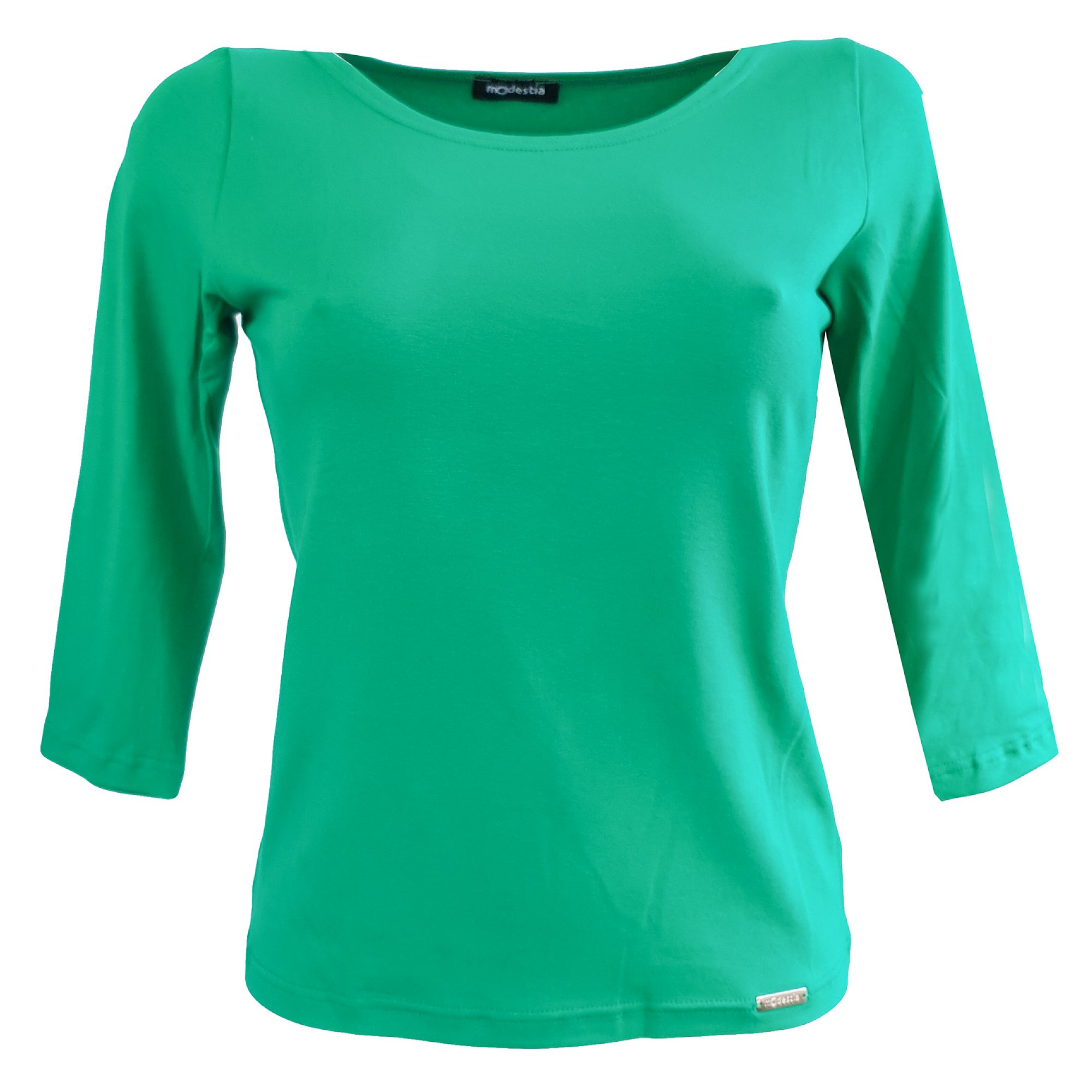 Klasická jednobarevná jemně projmutá halenka v zelené barvě, mělký kulatý výstřih, 3/4 rukáv. Materiál: 83 % viskóza 11% polyamid 6 % elastan
