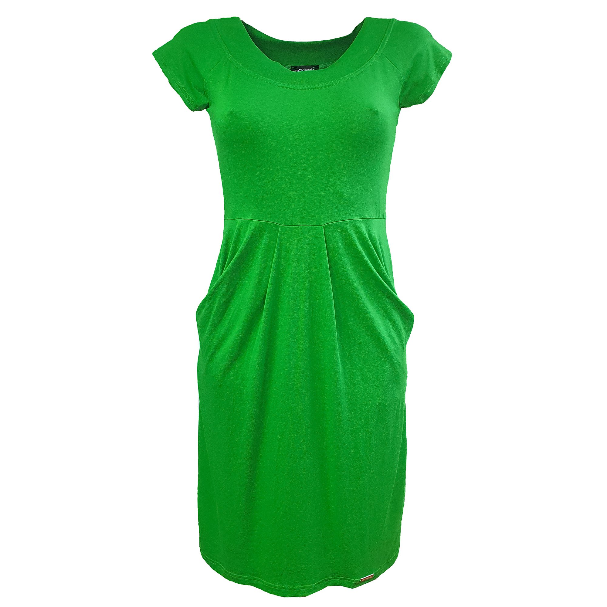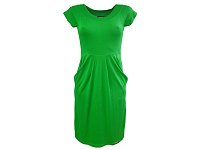 Zelené šaty s krásným otevřeným výstřihem, přestřižené pod prsy s velkými nabíranými kapsami. Délka u vel. 38 je 100 cm, stupňování v délce po 1,5 cm. Pereme v pračce na 30°. 95% viskóza 5% elastan
