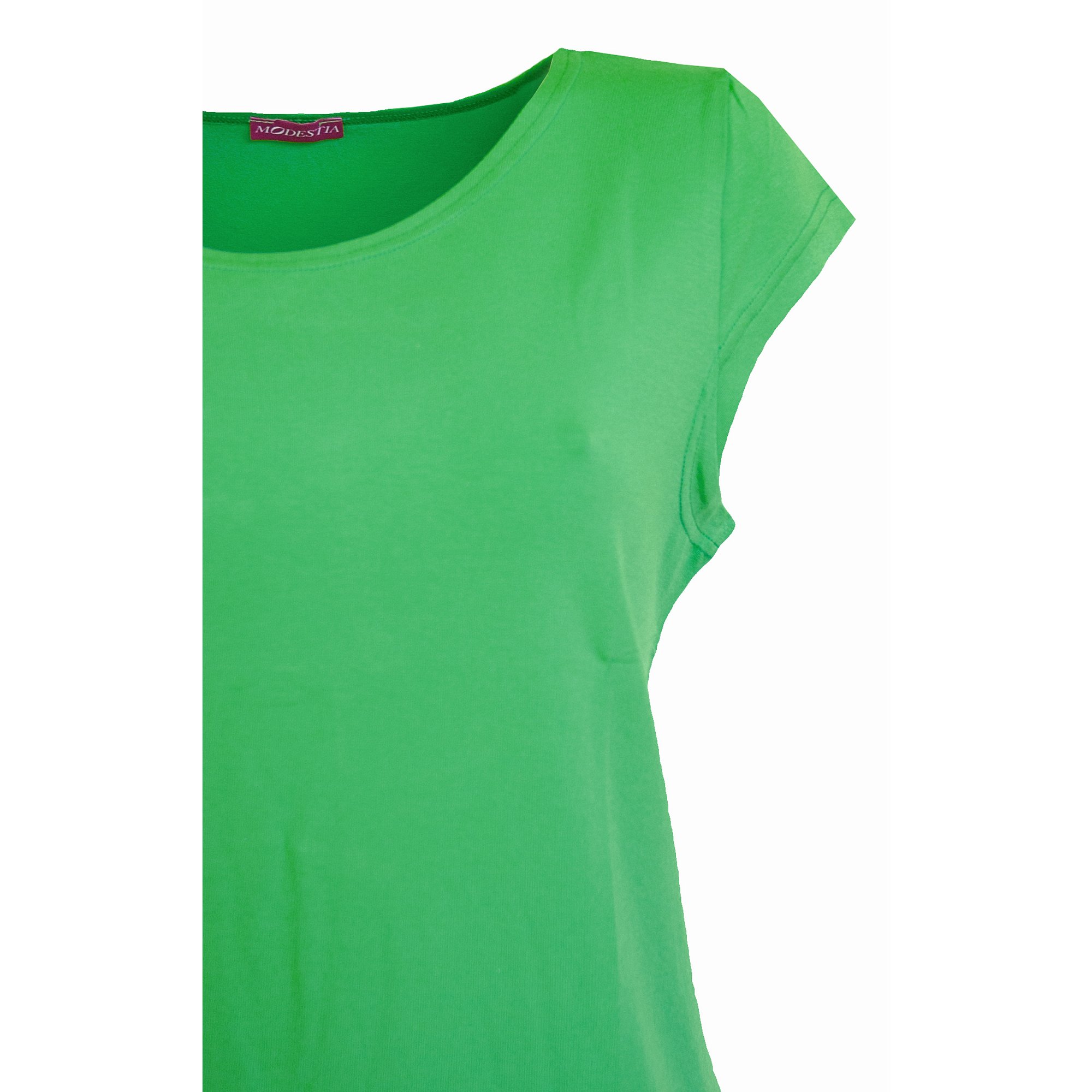 Klasický top s krátkým rukávem ve středně zelené barvě. Délka u vel. 38 je 58 cm, stupňování v délce po 2 cm. Materiál: 95% viskóza 5% elastan